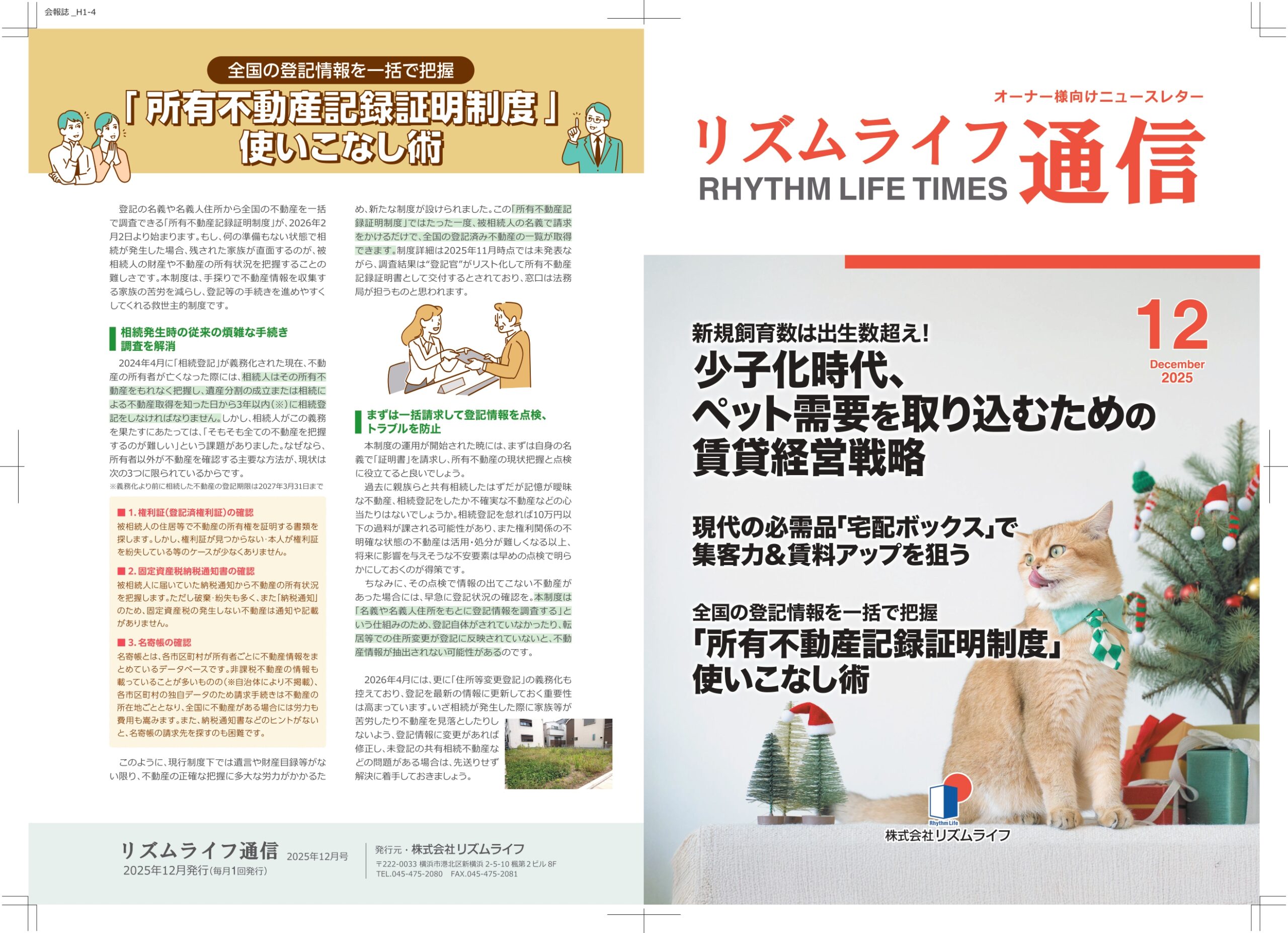 リズムライフ通信 2025/12 ブログ 関連一覧 ~ゴールデンウィークのお知らせ~ 2025.04.12 (公財)日管協預り金保証制度に加入いたしました。 2025.04.01 リズムライフ通信 2025/09 2025.09.20 リズムライフ通信 2025/10 2025.10.01 ~冬期休業のお知らせ~ 2024.12.12 ホームページをリニューアルしました 2023.05.01